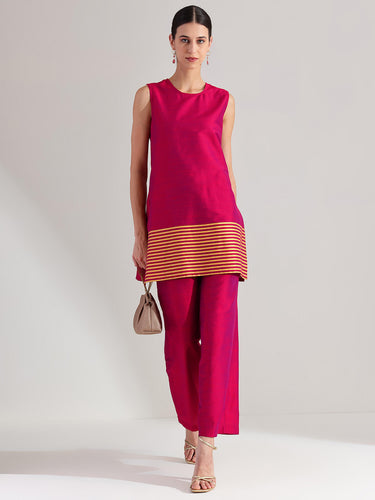 Enhanced with Gold stripe, opulent hue and modern design, this Pink & Gold Co-ord Set is both festive and versatile. Pair it with bold accessories and metallic flats for a contemporary look with flair.