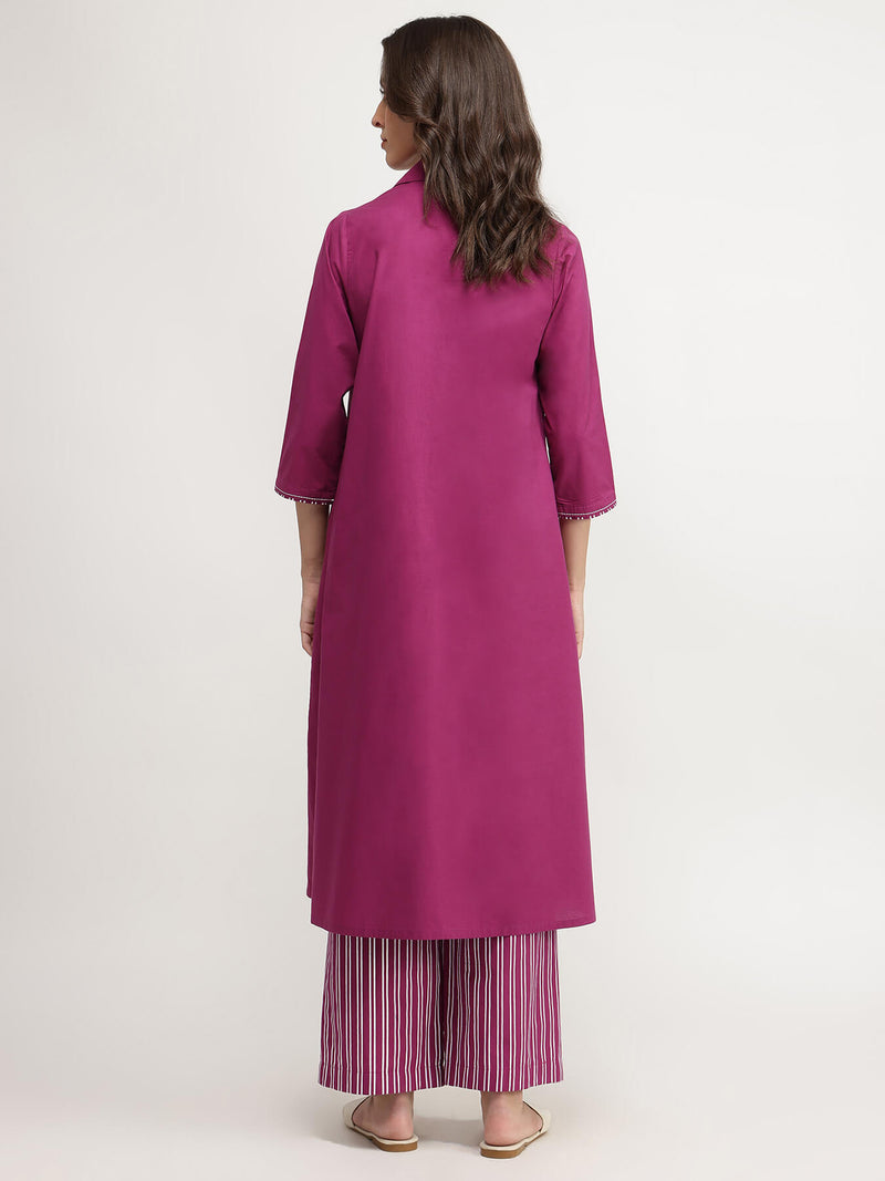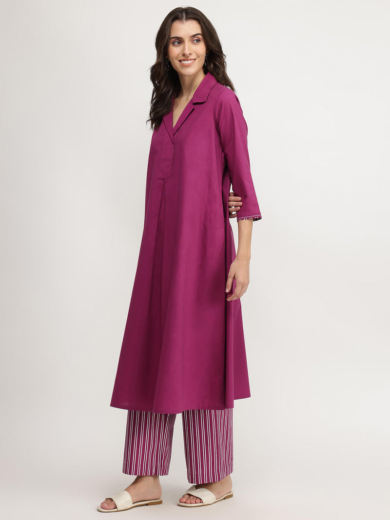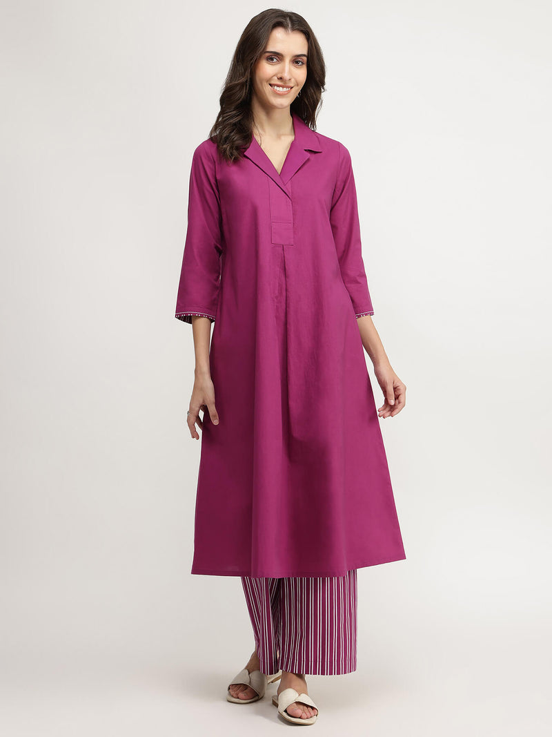 With subtle striped detailing, this magenta kurta set offers a neat, everyday look. Pair with kolhapuris or sandals for busy days that still need a little bit of styling.