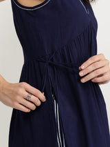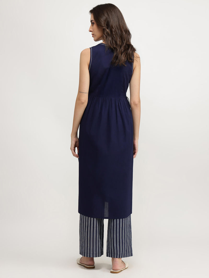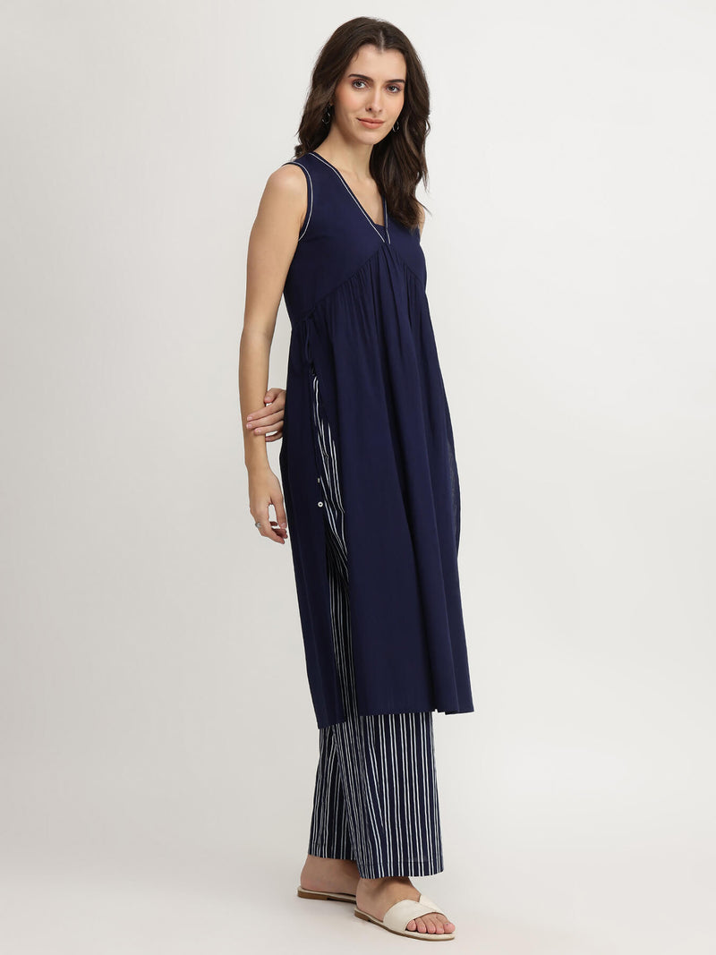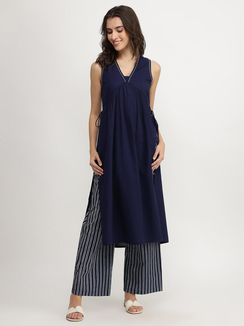 This navy kurta set features a sleeveless solid kurta, striped pants, a classic v-neck. A versatile option for daily or office wear that pairs easily with both flats and sling bags.