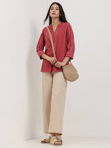 Subtle in shades of maroon and pink, this striped top is flattering and effortless. Wear it tucked in or out with denims, skirts, and minimal accessories.