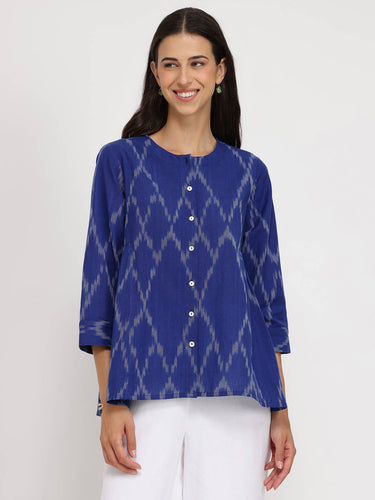 Add a pop of colour with this blue Cotton Ikat Top, featuring a handwoven design. The bold front pleat add structure, while the Ikat pattern offers artistry. Pair with black pants and gold jewellery.