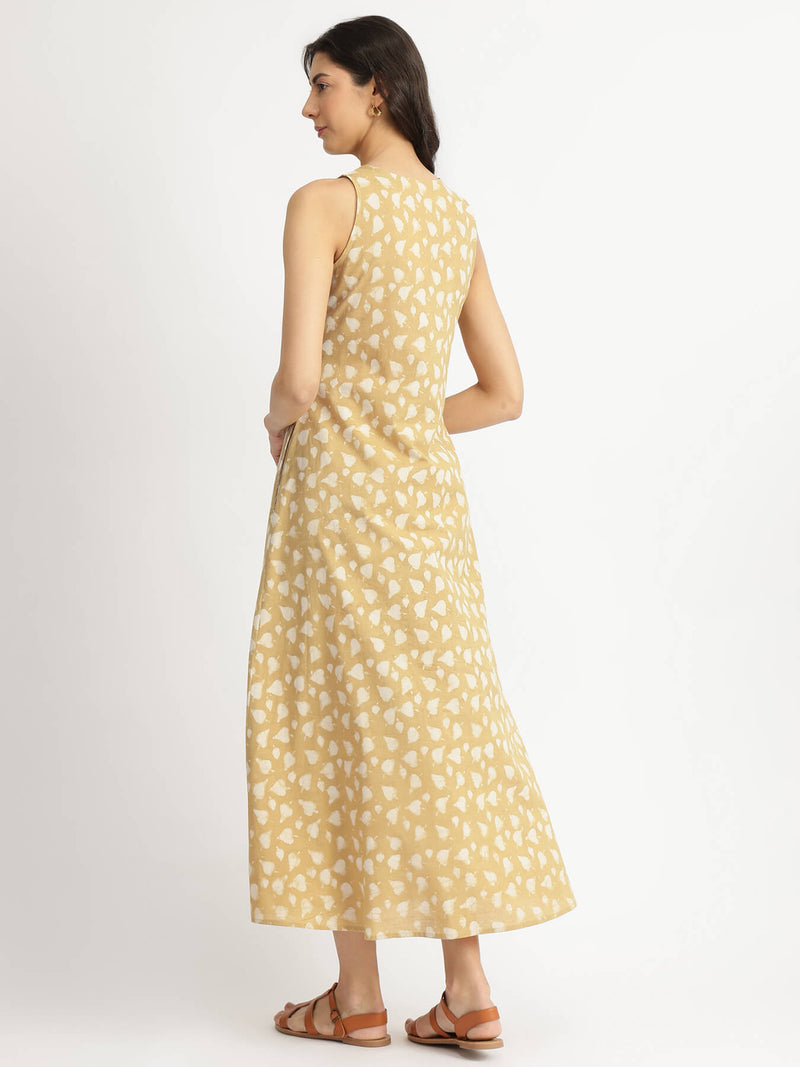 The Cotton Dabu Floral A-Line Dress in yellow is light, breezy, and perfect for chill summer days with friends. Pair it with woven sandals and a tote bag, giving you a carefree, vacation-ready vibe.
