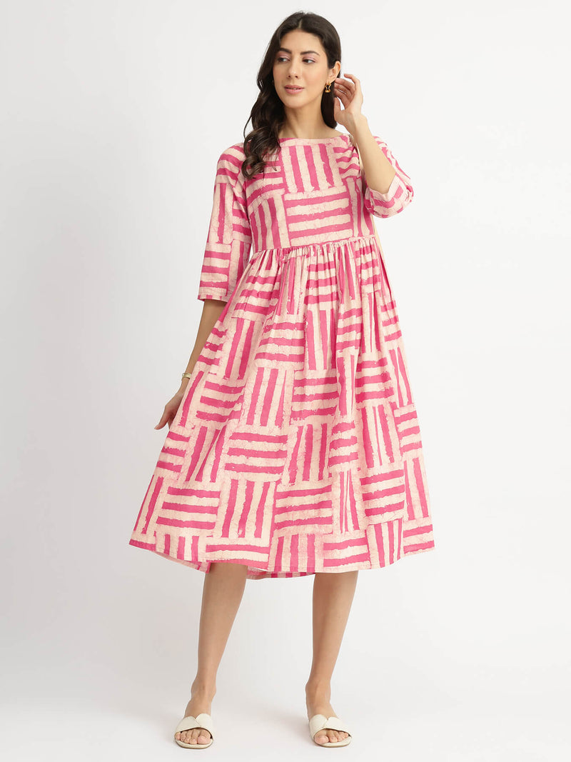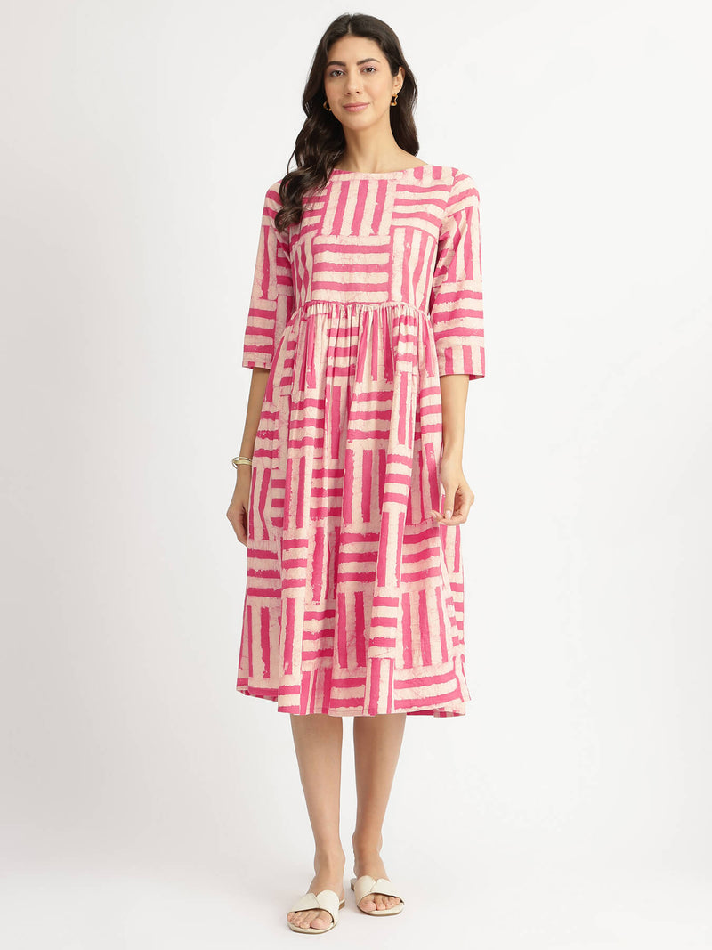 Refresh your wardrobe with the Cotton Dabu Stripe Play Dress in pink. Pair with a wide-brimmed hat and minimal sandals for a laid-back, beach-ready look that’s both cool and stylish.
