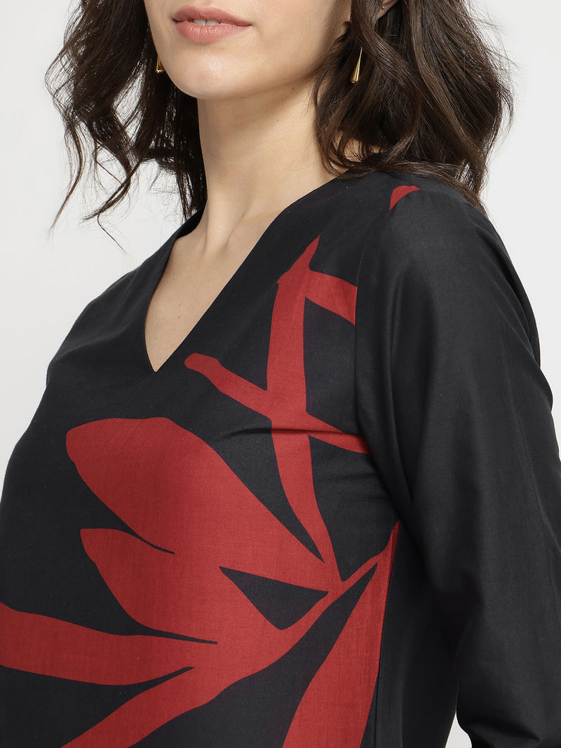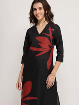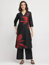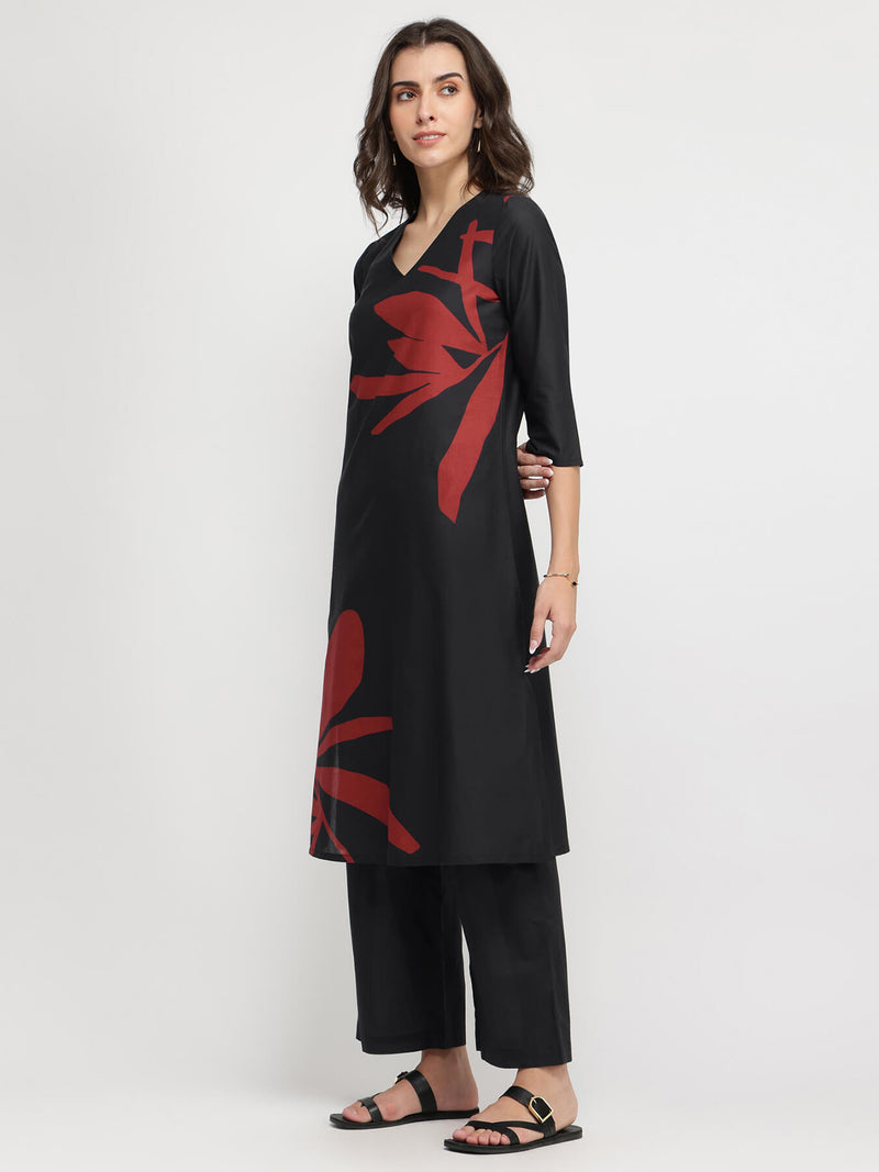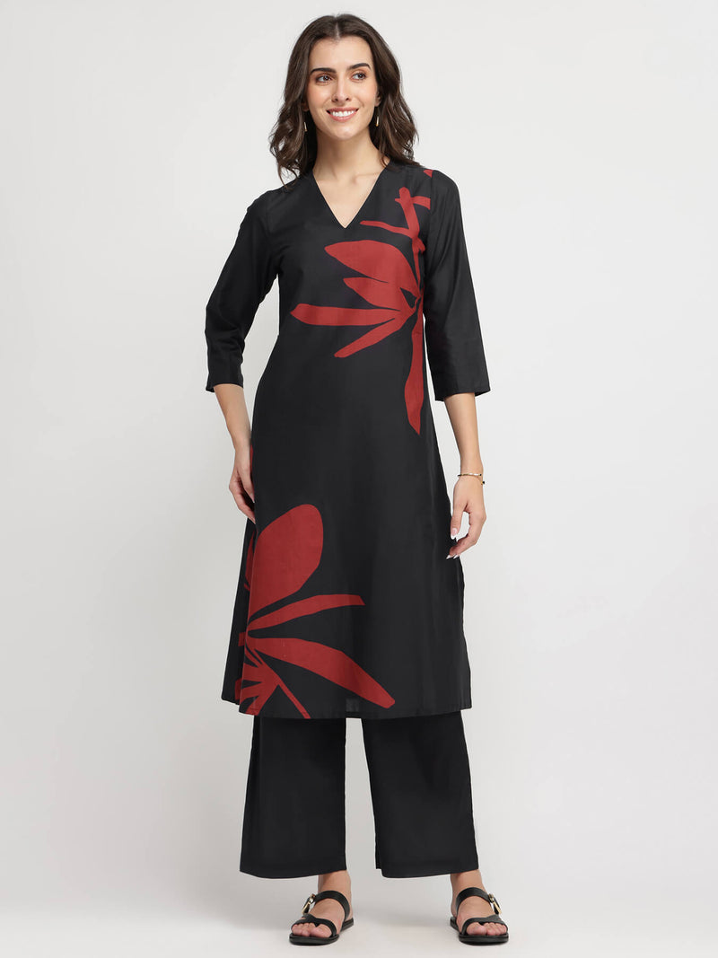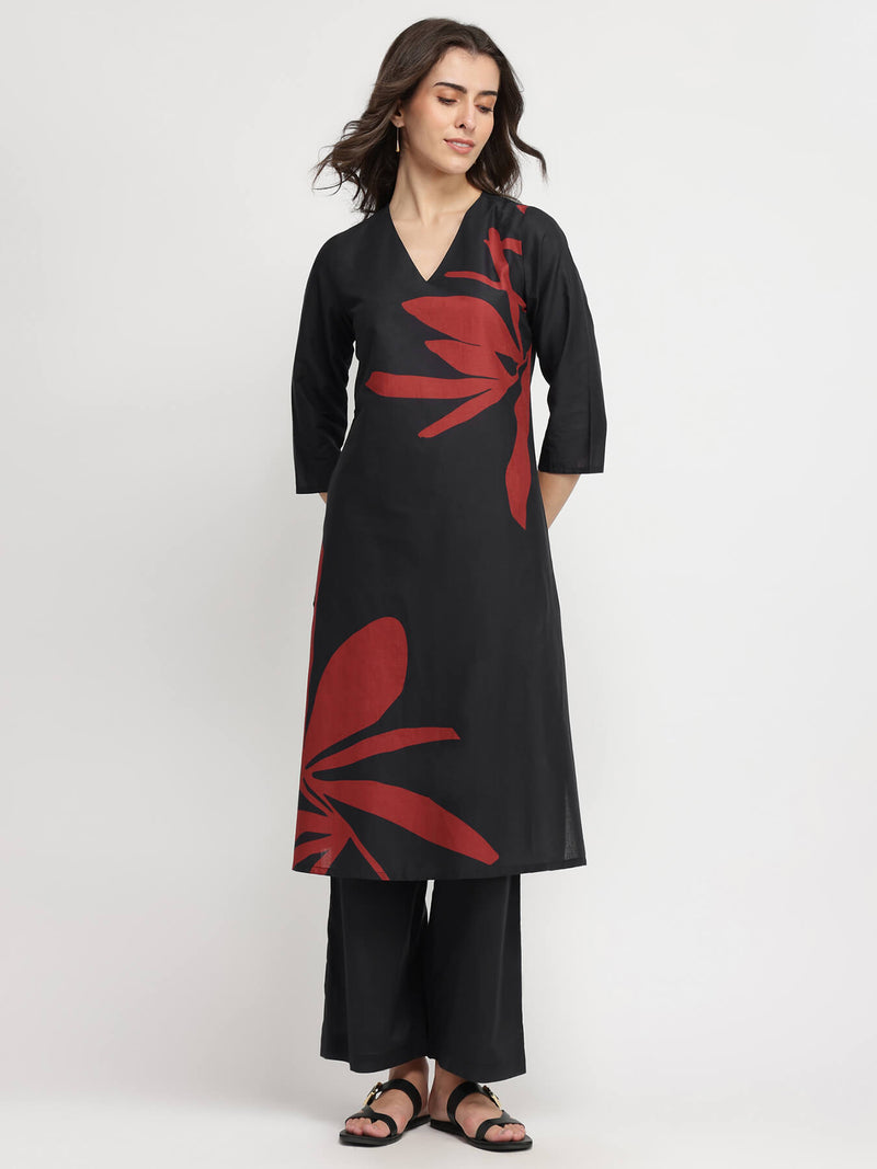 Statement florals in black and red bring a little drama to this A-line kurta set. Complete your look with a red bag, metallic bangles, and sandals that go the extra mile.