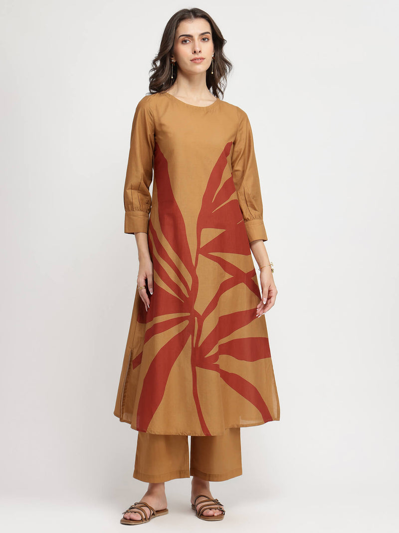 Cotton Floral A-Line Kurta Set - Rust & Beige