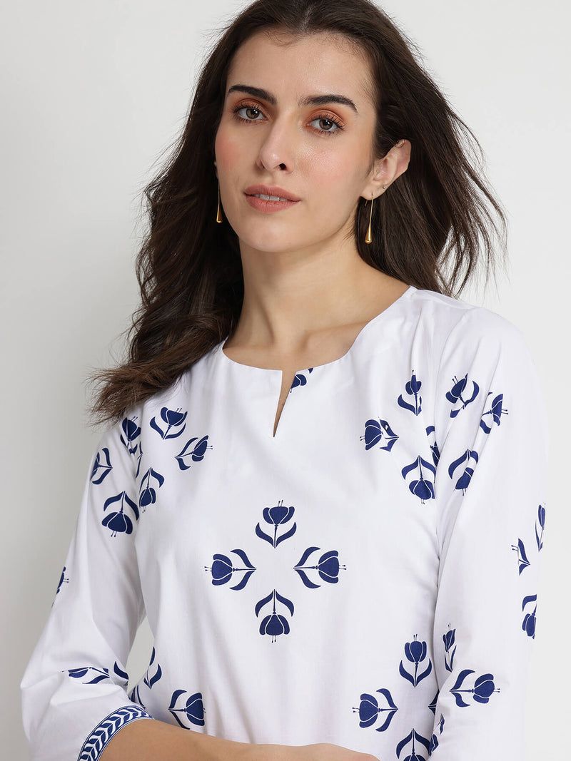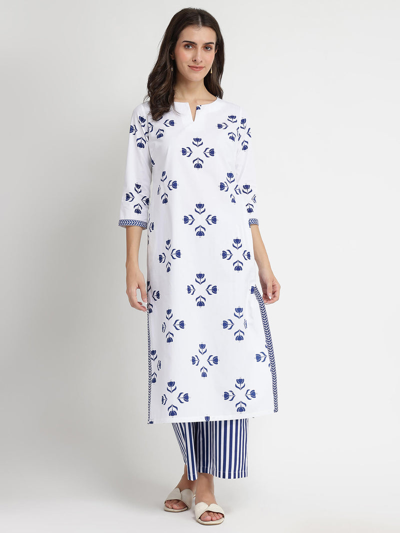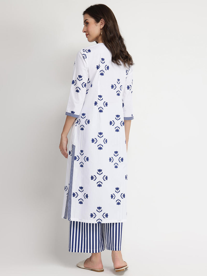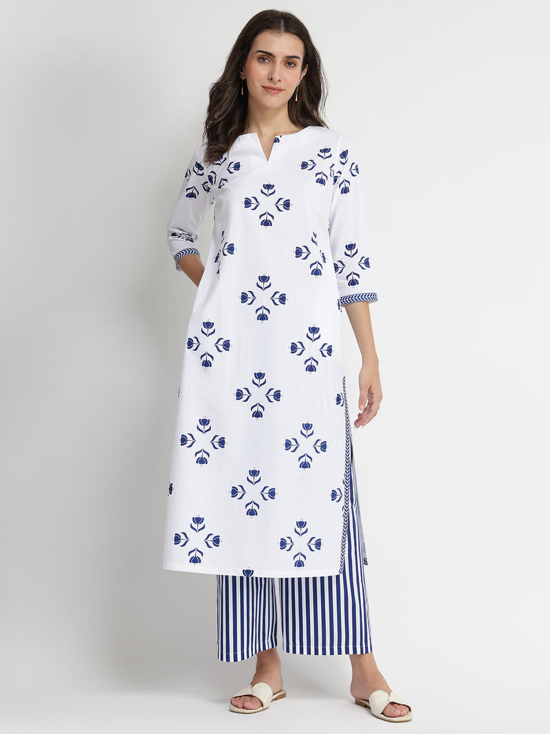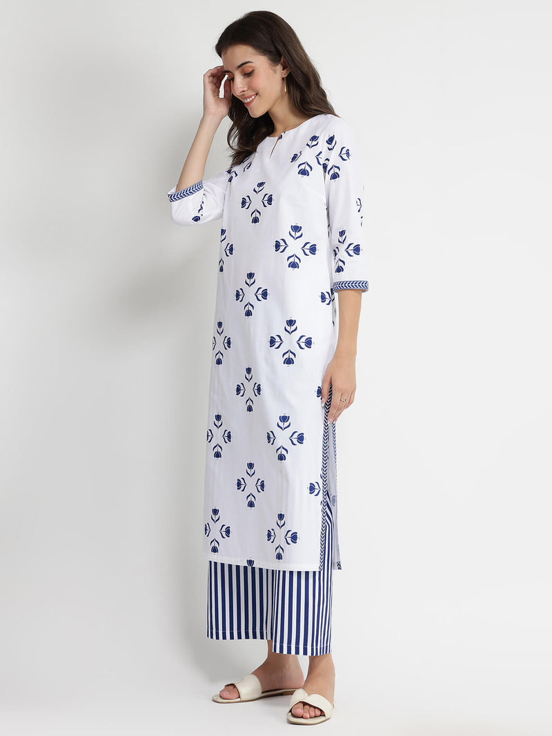 Cotton Floral Motif Kurta Set - Blue & White