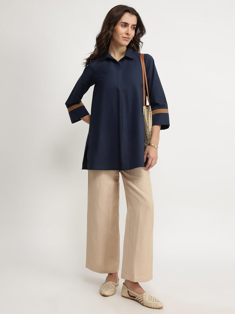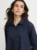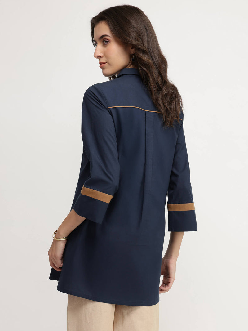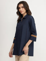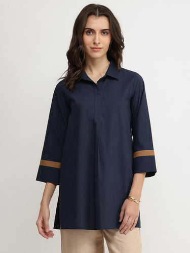Clean lines meet soft cotton in this versatile navy top—ideal for layering or wearing solo. Pair with neutral trousers and a light scarf for that in between-season vibe.