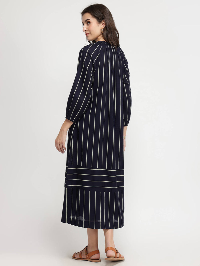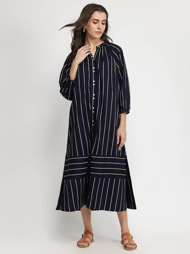 Cotton Stripe Play A-Line Dress - Navy Blue