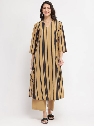 Cotton Striped & Solid Kurta Set - Mustard & Black