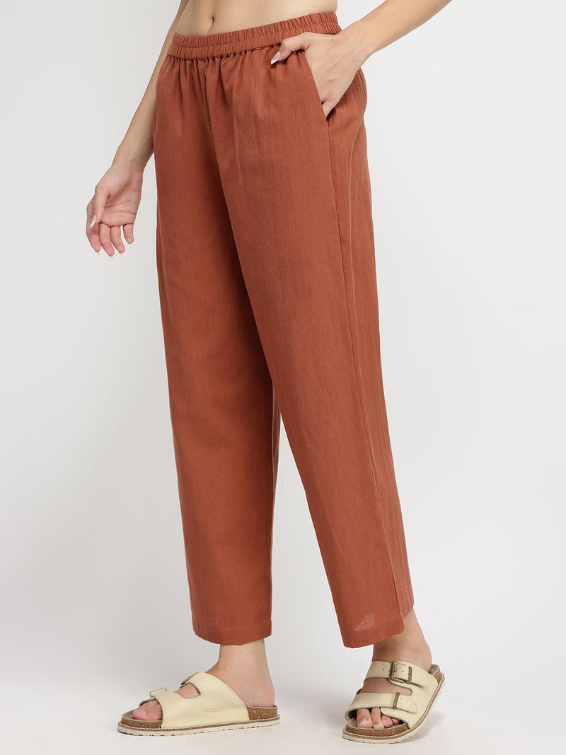 Blending comfort and style, this rust linen blend co-ord is perfect for busy work days. Add a messy bun, flat sandals, and a simple pendant for all-day ease and comfort.